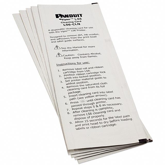 This is manufactured by Panduit Corp. The manufacturer part number is LS6-CLN. It is assigned with possible HTSUS value of 9612.10.9090. The product is not applicable. Specifications include 5 pieces. The product viper™, is a highly preferred choice for users. It is a type of cleaning card accessory. Its typical moisture sensitivity level is not applicable. The product is suitable for use with panduit ls6 printer (handheld). The product is designated with the ear99 code number.