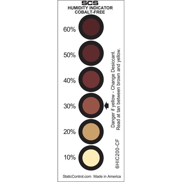 This is manufactured by Desco. The manufacturer part number is 6HIC200-CF. It is assigned with possible HTSUS value of 4810.13.5000. It is shipped in pail package . Specifications include meets ipc/jedec j-std-033a and mil-i-8835. The product is rohs3 compliant. It is a type of humidity card accessory. In addition, it is reach unaffected. Its typical moisture sensitivity level is not applicable. The product is suitable for use with moisture. It has a long 2 weeks standard lead time. The product is designated with the ear99 code number.