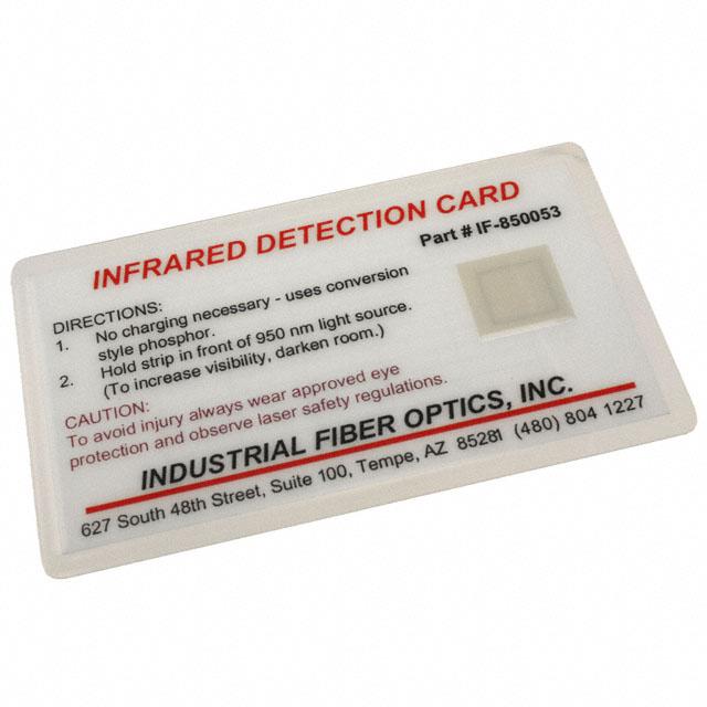 This is manufactured by Industrial Fiber Optics. The manufacturer part number is IF-850053. It is assigned with possible HTSUS value of 9023.00.0000. It is a type of ir detection card accessory. Its typical moisture sensitivity level is 1 (unlimited). In addition, bulk is the available packaging type of the product. The product is suitable for use with infrared light. The industrial fiber optics's product offers user-desired applications. The product is designated with the ear99 code number.