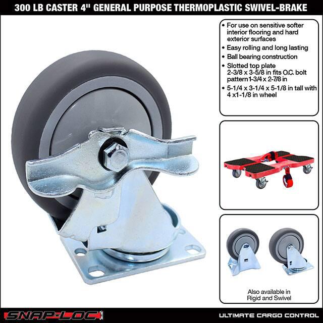 This is manufactured by SNAPLOC CARGO CONTROLSYSTEMS. The manufacturer part number is SLAC4SBT. It is shipped in box package . The product is not applicable. It is a type of caster accessory. In addition, it is reach info available upon request. Its typical moisture sensitivity level is not applicable. The product is suitable for use with dolly. The product is designated with the ear99 code number.