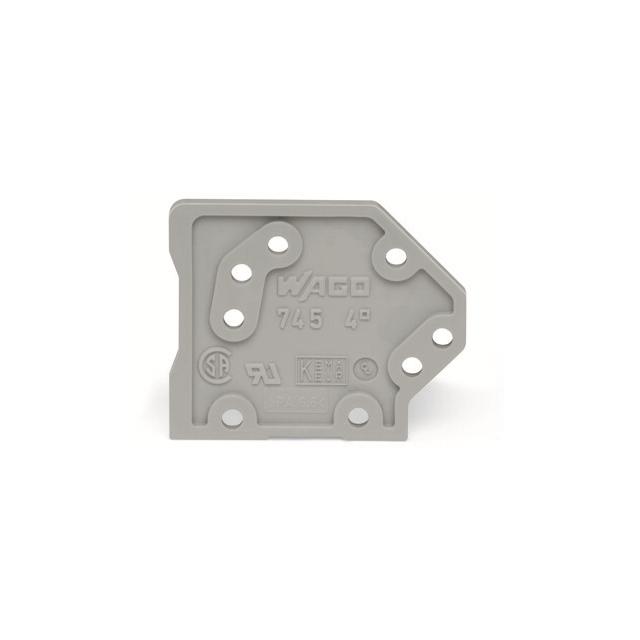 This is manufactured by WAGO Corporation. The manufacturer part number is 745-100. It is assigned with possible HTSUS value of 8538.90.8180. It is shipped in box package . It has a classic gray colour. The product is rohs3 compliant. Its typical moisture sensitivity level is not applicable. The product is suitable for use with terminal blocks. It has a long 12 weeks standard lead time. It comes in end plate configuration. The product is designated with the ear99 code number.