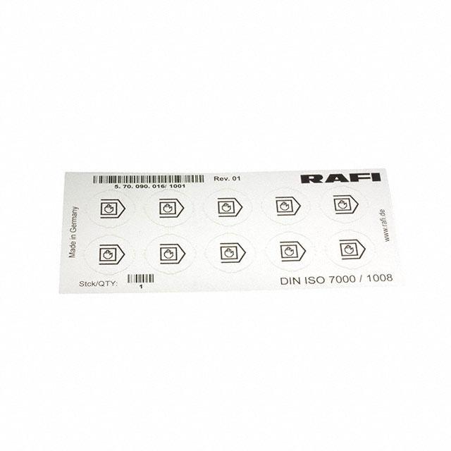 This is manufactured by RAFI USA. The manufacturer part number is 5.70.090.016/1001. It is assigned with possible HTSUS value of 8538.90.8180. The product is rohs3 compliant. It is a type of legend sheet accessory. In addition, it is reach unaffected. Its typical moisture sensitivity level is not applicable. In addition, bulk is the available packaging type of the product. The product is suitable for use with rafix 22 fs and 30 fs series. It has a long 4 weeks standard lead time. The rafi usa's product offers user-desired applications. Moreover, it corresponds to 5.70090, a base product number of the product. The product is designated with the ear99 code number.