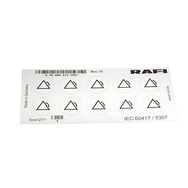 This is manufactured by RAFI USA. The manufacturer part number is 5.70.090.011/1001. It is assigned with possible HTSUS value of 8538.90.8180. It is shipped in bulk package . The product is rohs3 compliant. It is a type of legend sheet accessory. In addition, it is reach unaffected. Its typical moisture sensitivity level is not applicable. Moreover, it corresponds to 5.70090, a base product number of the product. It has a long 4 weeks standard lead time. The product is suitable for use with rafix 22 fs and 30 fs series. The product is designated with the ear99 code number.