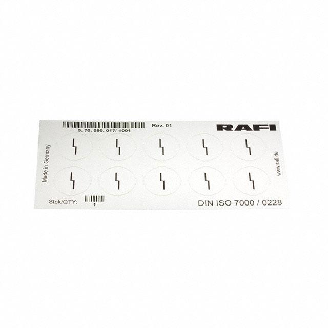 This is manufactured by RAFI USA. The manufacturer part number is 5.70.090.017/1001. It is assigned with possible HTSUS value of 8538.90.8180. It is shipped in bulk package . The product is rohs3 compliant. It is a type of legend sheet accessory. In addition, it is reach unaffected. Its typical moisture sensitivity level is not applicable. Moreover, it corresponds to 5.70090, a base product number of the product. It has a long 4 weeks standard lead time. The product is suitable for use with rafix 22 fs and 30 fs series. The product is designated with the ear99 code number.