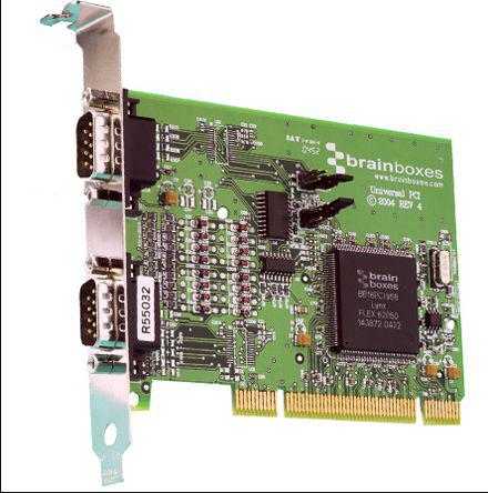 High Speed Serial Board (2 Ports) Fully PCI 2.1 compliant half sized PC board Data Includes set up and test utilities UART: 16550 PCI Serial Boards/RS-232 PCI Bus: High performance I/O slot in every desktop Pentium, Pentium (II) and Pentium Pro PC. PCI provides improved performance to all running applications by freeing up the CPU.,PCI boards are detected and configured automatically by the PC, avoiding conflicts in address and interrupts. PCI boards automatically implement a shared interrupt system so maximising use of precious system resources.,The Windows device drivers supplied with each serial card reads the PCI assigned setup and configures your system accordingly. Products in this range are supplied with Vista and Windows drivers and are Plug-and Play compatible.,PCI 2.3 requires that all plug-in cards support 3.3V signalling. To support many older systems that use 5V signalling the following Brainboxes products are compatible with both 3.3V and 5V signalling.All the boards in this range also share the same following specifications: Data bits: 5, 6, 7 or 8 Stop bits: 1 or 2 Parity: Odd, even, mark, none or spaces