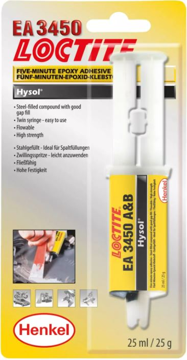 The LOCTITE® EA 3450 is a two-component, room-temperature curing epoxy adhesive designed for bonding metals, ceramics, rigid plastics, and wood. It features gap-filling properties, making it suitable for rough or poorly fitting surfaces. The 25ml adhesive cures rapidly after mixing and develops high bond strength, ensuring durable repairs and assemblies. Its metallic-grey colour provides a clean finish, and it can be drilled, sanded, and painted after curing.