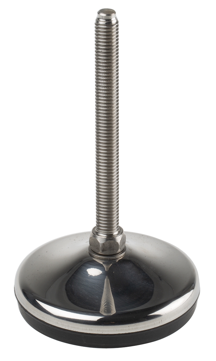This is Stainless Steel Levelling Base 80mm Dia. 160mm 1000kg Static load Capacity 125mm M12 10° Tilt Angle manufactured by RS Pro. The manufacturer part number is 162-3262. The product has approximately 1000kg capacity of static load . Moreover, its shore hardness is 70 shore a . It has a decent black colour. It has a maximum 160mm adjustment height . In addition, the height is 160. It has a typical thread size of m10. Its tilt angle is 10° . Features a thread length of 125mm. Its foot is made using rubber material . Its base is made up of stainless steel material .