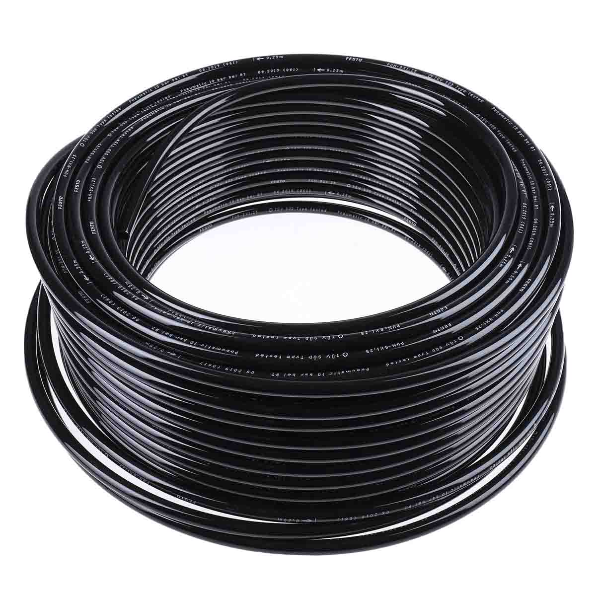 This is Black 50m Polyurethane Air Hose manufactured by Festo. The manufacturer part number is PUN-6X1-SW. Its hose inside diameter is about 4mm . Whereas, the minimum operating temperature of the product is -35°c. It features 10 bar maximum operating pressure. It has a maximum operating temperature of +60°c. It has a decent black colour. The product is made from highly stable and reliable polyurethane. While it has 159665 of model number. It has a standard 6mm hose outside diameter . Its accurate length is 50m. The product has a pun manufacturer series. It contains 1 high-quality tubes .