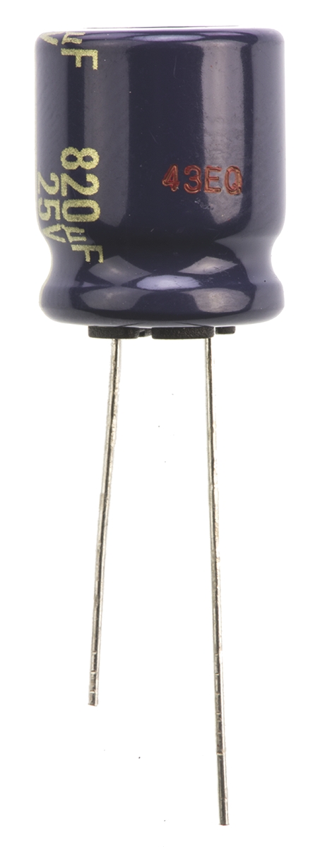 This is Aluminium Electrolytic Capacitor 820μF 25V dc 12.5mm FK Radial Series Through Hole Electrolytic ±20% manufactured by Panasonic. The manufacturer part number is EEUFK1E821S. Its diameter is 12.5mm. Furthermore, 1.4a is the ripple current. Furthermore, it is polar polarised. The given dimensions of the product include 12.5 (dia.) x 15mm. The product is available in radial, through hole configuration. The product fk radial, is a highly preferred choice for users. In addition, the height is 15mm. It provides a 820µf of capacitance value. It carries a 25v dc of voltage. Whereas, the minimum operating temperature of the product is -55°c. It provides a long-lasting service for a period of 5000h. The lead features 5mm pitch. It has a maximum operating temperature of +105°c. It features ±20% of tolerance value. The product complies with automotive standard - aec-q200. This product use aluminium electrolytic technology.