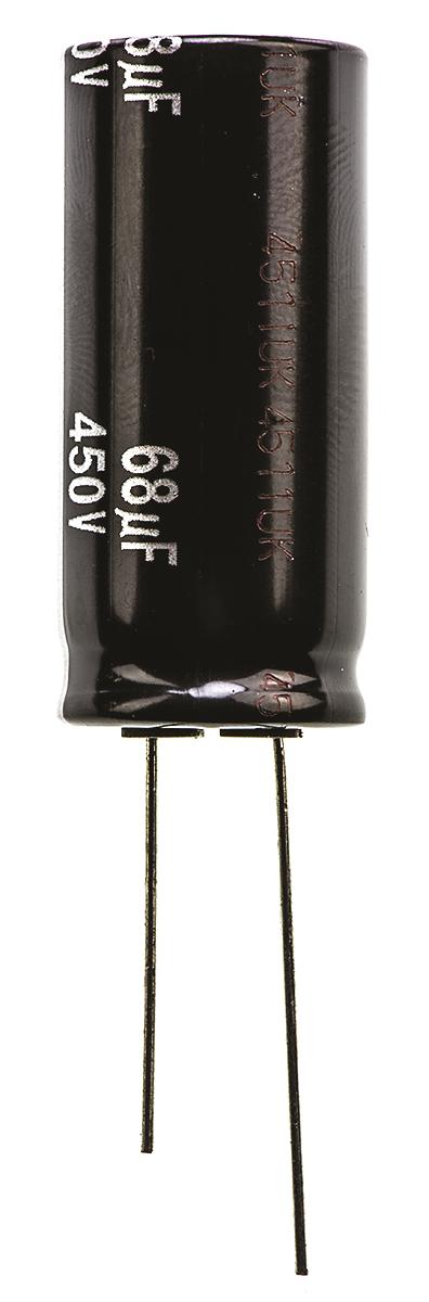 This is Aluminium Electrolytic Capacitor 68μF 450V dc 18mm EE RADIAL Series Through Hole Electrolytic ±20% manufactured by Panasonic. The manufacturer part number is EEUEE2W680. Its diameter is 18mm. Furthermore, 1.8a is the ripple current. Furthermore, it is polar polarised. The given dimensions of the product include 18 (dia.) x 40mm. The product is available in radial, through hole configuration. The product ee radial, is a highly preferred choice for users. In addition, the height is 40mm. It provides a 68µf of capacitance value. It carries a 450v dc of voltage. Whereas, the minimum operating temperature of the product is -25°c. It provides a long-lasting service for a period of 10000h. The lead features 7.5mm pitch. It has a maximum operating temperature of +105°c. It features ±20% of tolerance value. This product use aluminium electrolytic technology.