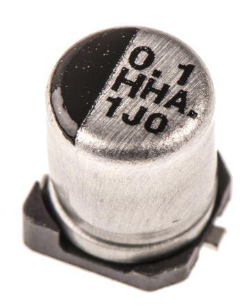 This is Aluminium Electrolytic Capacitor 100nF 50 V dc 4mm Surface Mount B HA SMD Series Lifetime 1000h +105°C manufactured by Panasonic. The manufacturer part number is EEEHA1HR10R. The given dimensions of the product include 4 (dia.) x 5.4mm. It provides a 100 nf of capacitance value. It features ±20% of tolerance value. The product has been well-designed with metal can construction. It has a maximum operating temperature of +105°c. The terminal is a surface mount type. It features a given value of +20% tolerance plus. Furthermore, the lead has 0.65mm diameter. It harbors 3 μa of leakage current. The lead features 1mm pitch. Concerning its package and casing, it is b. Its diameter is 4mm. Furthermore, 1ma is the ripple current. The product is available in surface mount configuration. The product ha smd, is a highly preferred choice for users. In addition, the height is 5.4mm. While it has tolerance minus of -20%. It carries a 50 v dc of voltage. Whereas, the minimum operating temperature of the product is -40°c. It provides a long-lasting service for a period of 1000h. This product use electrolytic technology.