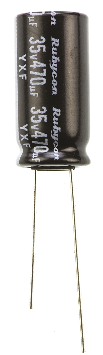 This is Aluminium Electrolytic Capacitor 470μF 35V dc 10mm Through Hole YXF Series Through Hole Electrolytic ±20% manufactured by Rubycon. The manufacturer part number is 35YXF470M10X20. Its diameter is 10mm. Furthermore, 1.05a is the ripple current. The given dimensions of the product include 10 (dia.) x 20mm. The product is available in radial, through hole configuration. The product yxf, is a highly preferred choice for users. In addition, the height is 20mm. It provides a 470µf of capacitance value. It carries a 35v dc of voltage. It harbors 3 μa of leakage current. It provides a long-lasting service for a period of 7000h. The lead features 5mm pitch. It has a maximum operating temperature of +105°c. It features ±20% of tolerance value. Whereas, the minimum operating temperature of the product is -40°c. This product use aluminium electrolytic technology.
