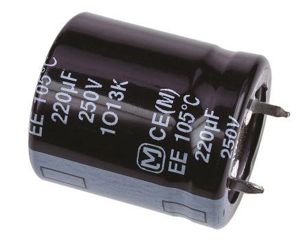 This is Aluminium Electrolytic Capacitor 220μF 250 V dc 22mm Through Hole EE SNAP IN Series Lifetime 3000h +105°C manufactured by Panasonic. The manufacturer part number is EETEE2E221HJ. Its diameter is 22mm. It features a given value of +20% tolerance plus. Furthermore, 1.43a is the ripple current. The product is available in through hole configuration. The given dimensions of the product include 22 (dia.) x 25mm. Furthermore, the lead has 0.8mm diameter. The terminal is a through hole type. The product ee snap in, is a highly preferred choice for users. In addition, the height is 25mm. It provides a 220 µf of capacitance value. While it has tolerance minus of -20%. The product has been well-designed with snap-in construction. It carries a 250 v dc of voltage. Whereas, the minimum operating temperature of the product is -40°c. It provides a long-lasting service for a period of 3000h. The lead features 10mm pitch. It has a maximum operating temperature of +105°c. It features ±20% of tolerance value. This product use electrolytic technology.