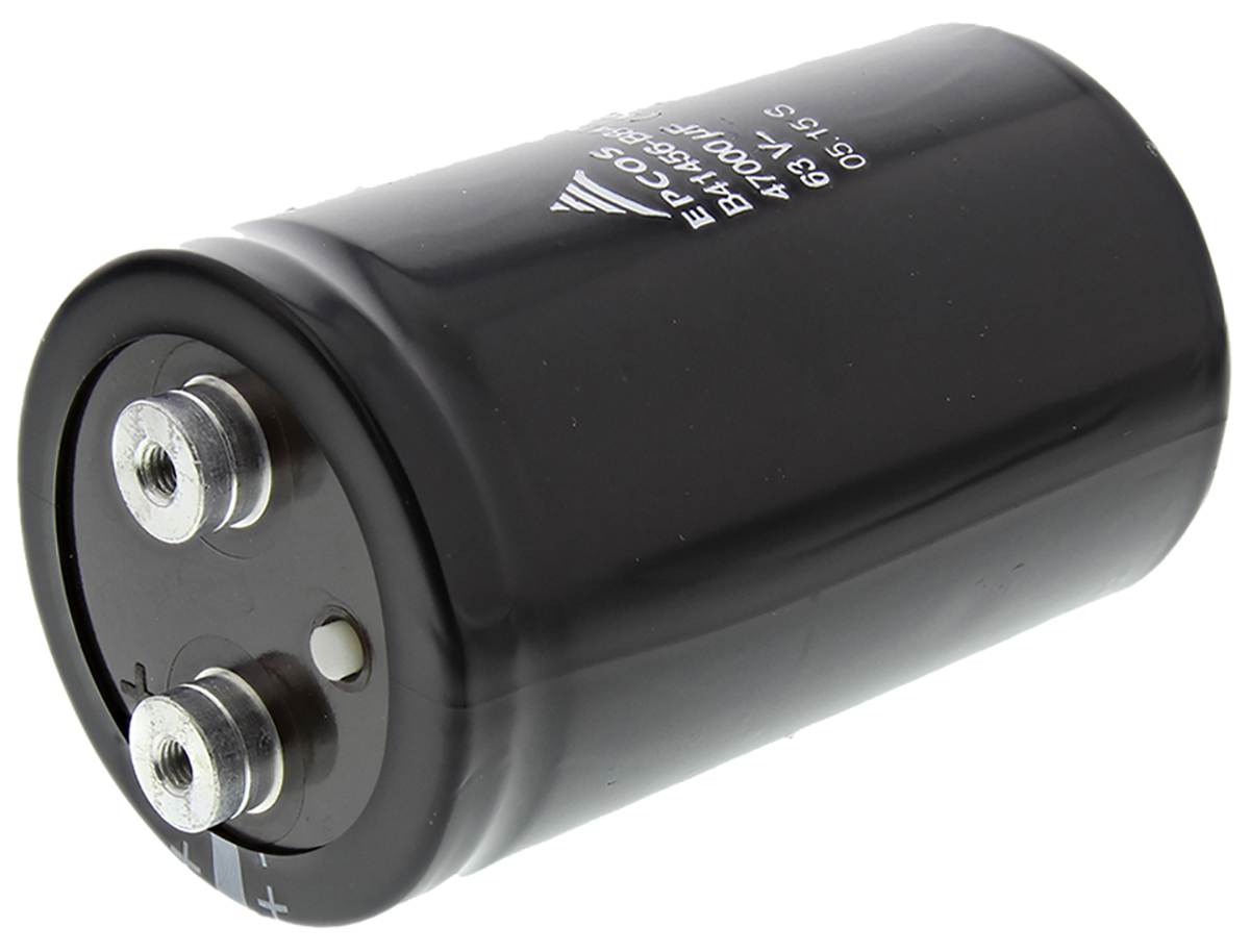 This is Aluminium Electrolytic Capacitor 47000μF 63V dc 64.3mm Screw Terminal B41456 Series Chassis Mount Electrolytic manufactured by EPCOS. The manufacturer part number is B41456B8479M000. Its diameter is 64.3mm. Furthermore, 18a is the ripple current. The given dimensions of the product include 64.3 (dia.) x 105.7mm. The product is available in screw terminal configuration. The product b41456, is a highly preferred choice for users. It has 5mω equivalent series resistance. In addition, the height is 105.7mm. It provides a 47000µf of capacitance value. It carries a 63v dc of voltage. Whereas, the minimum operating temperature of the product is -40°c. It provides a long-lasting service for a period of 12000h. It has a maximum operating temperature of +85°c. It features ±20% of tolerance value. This product use aluminium electrolytic technology.