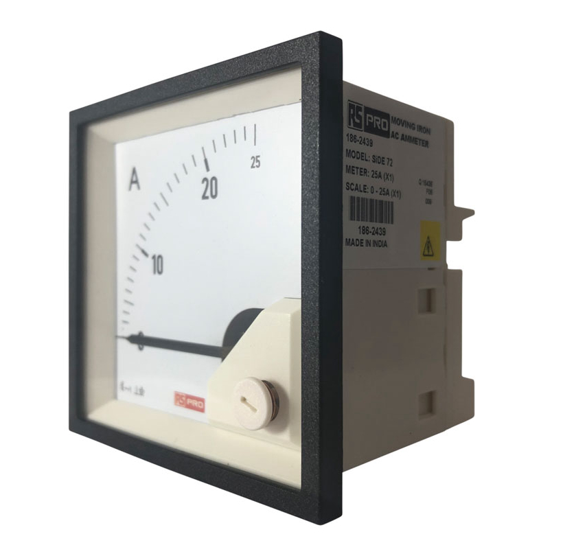 This is Analogue Panel Ammeter 25 (Input)A AC 72mm x 72mm 1 % Moving Iron manufactured by RS PRO. The manufacturer part number is 186-2439. It contains a moving iron . The product has +65°c maximum temperature. Moreover, its cutout is 68mm in width . While its minimum temperature is -10°c. Its meter accuracy is 1 % . It has a minimum 0 (input)a display value . This product harbours ac current. The product comes in 54 (<30 a)mm depth. Its cutout height is 68mm . Additionally, it has a maximum 25 (input)a value . Its measurement range is 0 → 25 (input)a .