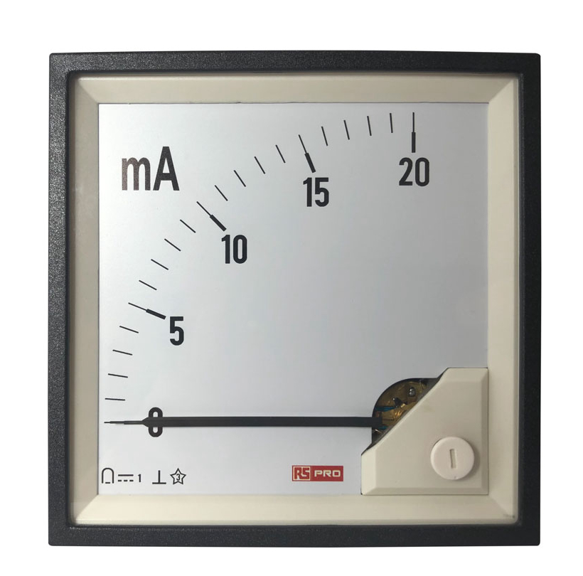 This is Analogue Panel Ammeter 20 (Input)mA DC 96mm x 96mm 1 % Moving Coil manufactured by RS PRO. The manufacturer part number is 186-2501. It contains a moving coil . The product has +65°c maximum temperature. Moreover, its cutout is 92mm in width . While its minimum temperature is -10°c. Its meter accuracy is 1 % . It has a minimum 0 (input)ma display value . This product harbours dc current. The product comes in 54 (<4 a)mm depth. Its cutout height is 92mm . Additionally, it has a maximum 20 (input)ma value . Its measurement range is 0 → 20 (input)ma .