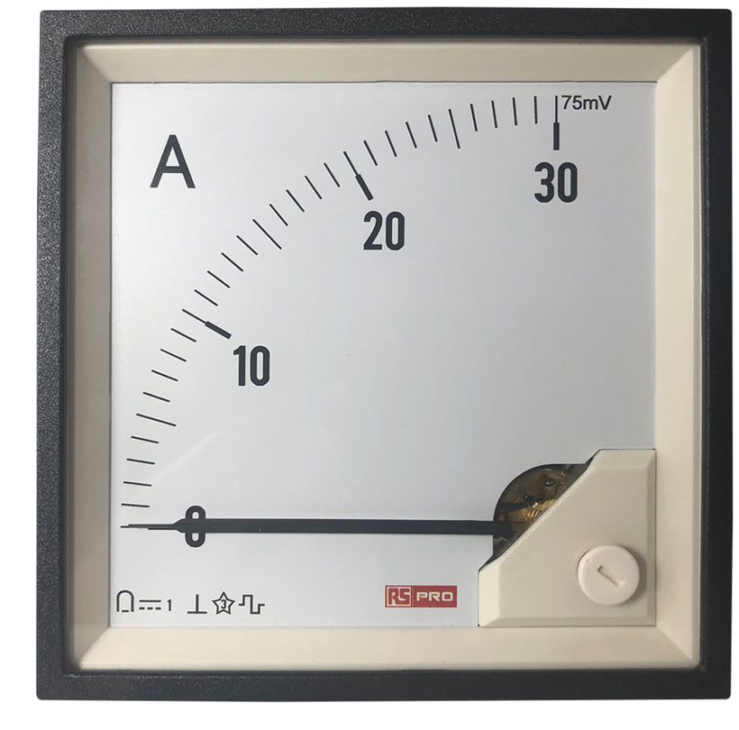 This is Analogue Panel Ammeter DC 96mm x 96mm 1 % Moving Coil manufactured by RS PRO. The manufacturer part number is 186-2504. It contains a moving coil . The product has +65°c maximum temperature. Moreover, its cutout is 92mm in width . While its minimum temperature is -10°c. Its meter accuracy is 1 % . This product harbours dc current. The product comes in 54 (<4 a) mm, 67 (5 → 60 a) mm, 67 (60 → 100 a) mm depth. Its cutout height is 92mm . Additionally, it has a maximum 0/30a for shunt 75mv value . Its measurement range is 0/30a for shunt 75mv .
