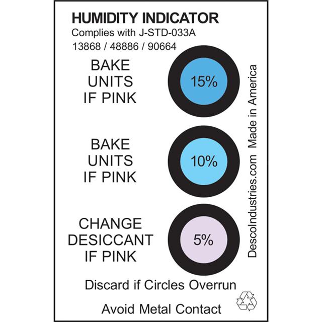 This is manufactured by Desco. The manufacturer part number is 13868. It is assigned with possible HTSUS value of 4810.32.6500. It is shipped in bulk package . Specifications include meets ipc/jedec j-std-033a and mil-i-8835. The product is rohs3 compliant. It is a type of humidity card accessory. In addition, it is reach unaffected. Its typical moisture sensitivity level is not applicable. The product is suitable for use with moisture. It has a long 3 weeks standard lead time. The product is designated with the ear99 code number.
