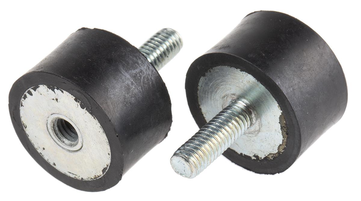 This is R8B2515M618-3 Shock Mount M6 23.65 kg 47.52 kg Compression Load Male to Male Natural Rubber manufactured by RS Pro. The manufacturer part number is 162-3246. Its diameter is 25mm. Moreover, its shore hardness is 70 shore a . Whereas, the minimum operating temperature of the product is -25°c. Moreover, it has 15mm of overall height. The product is made from highly stable and reliable natural rubber. It contains an anti vibration male to female bobbin type mount . It has a typical thread size of m6. It has about 1.5mm compression deflection . Its shearing load is about 21kg . In addition, it has a/an zinc plated steel as metal work . It has a maximum operating temperature of +70°c. In addition, its compression load is about 69kg .