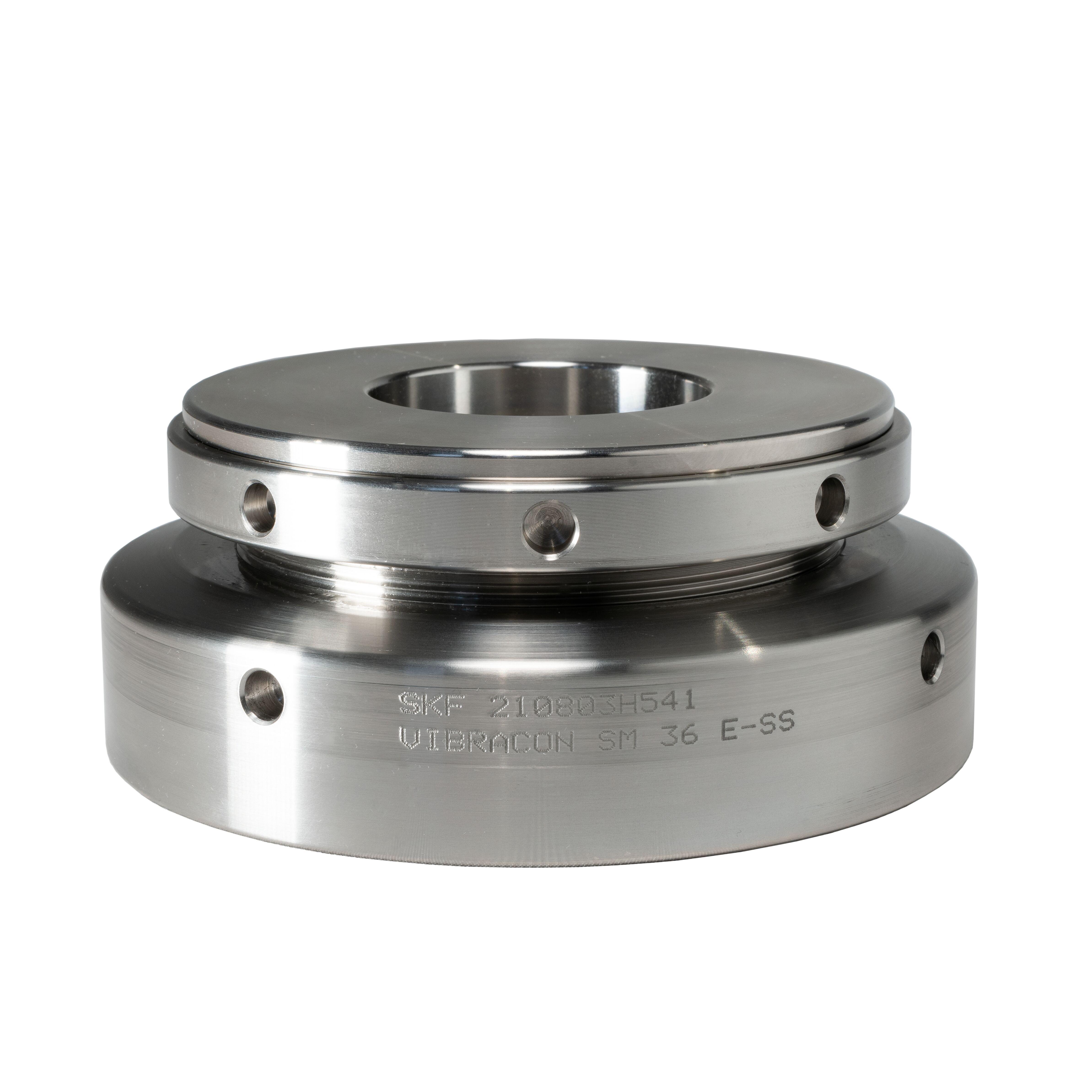 This is Adjustable chocks VIBRACON Circular M36 to M42 Anti Vibration Mount manufactured by SKF. The manufacturer part number is SM 36 E-SS. Its diameter is 160mm. The product has approximately 65000dan capacity of static load . Its bore is 70mm in length . The product is available in bolt configuration. It is assigned with a trade name of vibracon. Moreover, it has 70mm of overall height. The product is made from highly stable and reliable 316l stainless steel. It contains an anti vibration adjustable chocks type mount . It has a typical thread size of m36x42. In addition, it has an attractive circular shape foot . It contains a standard 45mm bore diameter . Its outer diameter is 160mm.