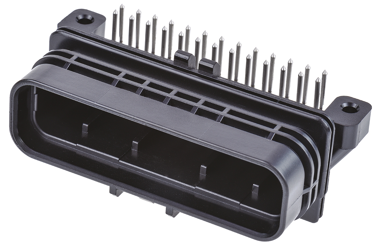 This is SUPER SEAL Series 2 Row 26 Way Through Hole Plug Header with Solder Termination Method manufactured by TE Connectivity. The manufacturer part number is 6473711-1. Whereas, the minimum operating temperature of the product is -40°c. The product is available in through hole configuration. In addition, male is the available "Gender" of the product. It allows solder termination method. In addition, the height is 27.9mm. The product also features robust pet housing material. Furthermore, the product is 45.5mm wide. The product comes in 36.5mm depth. It comes in 2 of rows. The high-quality gold over nickel is used as contact plating material. The product superseal, is a highly preferred choice for users. The product contains 26 contacts. It comes in header configuration. It has a maximum operating temperature of +125°c. The product is made from sturdy brass materials.