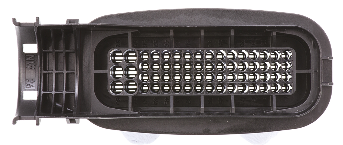 This is AMP MCP 1.5/2.8 Series 62 Way Cable Mount Plug Housing manufactured by TE Connectivity. The manufacturer part number is 1-1718324-1. The product is available in cable mount configuration. In addition, male is the available "Gender" of the product. It has a decent black colour. In addition, the height is 45.8mm. The product also features robust pbt housing material. Furthermore, the product is 113.25mm wide. The product comes in 70.7mm depth. It comes in 4 of rows. The product amp mcp 1.5/2.8, is a highly preferred choice for users. The product contains 62 contacts. It comes in automotive connector housing configuration.
