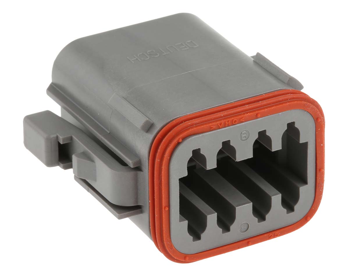This is DT Series 2 Row 8 Way Plug Connector manufactured by Deutsch. The manufacturer part number is DT06-08SA. The product has a current rating of 13a. In addition, male is the available "Gender" of the product. It has a decent grey colour. In addition, the height is 19.71mm. The product also features robust pa gf housing material. Furthermore, the product is 37.21mm wide. The product comes in 30.91mm depth. It comes in 2 of rows. Whereas, the minimum operating temperature of the product is -55°c. The product dt, is a highly preferred choice for users. The product contains 8 contacts. It comes in automotive connector configuration. It has a maximum operating temperature of +125°c.