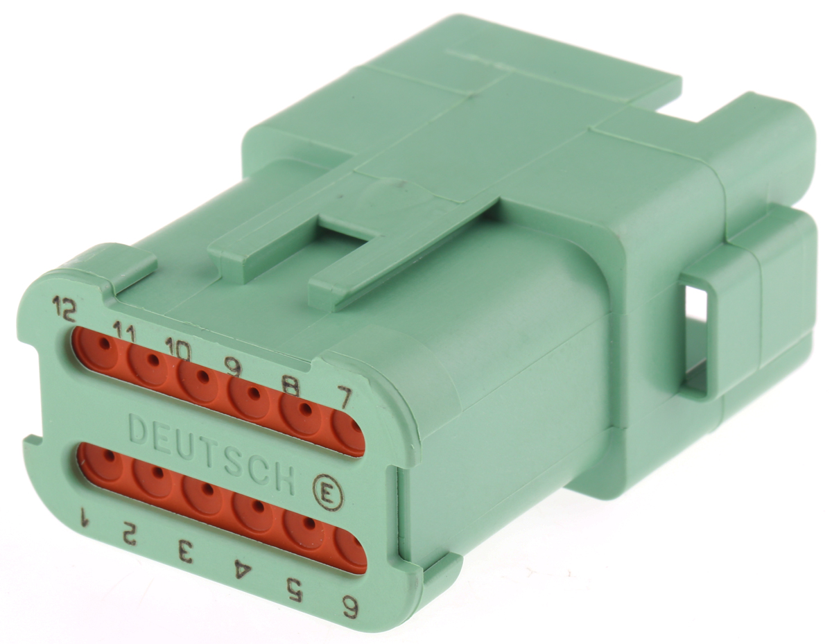 This is DT Series 2 Row 12 Way Socket Connector with Crimp Termination Method manufactured by Deutsch. The manufacturer part number is DT0412PC-CE07. The product has a current rating of 13a. Whereas, the minimum operating temperature of the product is -55°c. In addition, female is the available "Gender" of the product. It has a decent green colour. It allows crimp termination method. In addition, the height is 22.25mm. The product also features robust thermoplastic housing material. Furthermore, the product is 40.56mm wide. The product comes in 51.89mm depth. It comes in 2 of rows. The high-quality nickel is used as contact plating material. The product dt, is a highly preferred choice for users. The product contains 12 contacts. It comes in automotive connector configuration. It has a maximum operating temperature of +125°c. The product is made from sturdy copper alloy materials.
