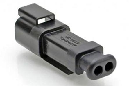 This is AT Series 04 Series Number 1 Row 2 Way IP67 Cable Mount Socket Automotive Connector manufactured by Amphenol. The manufacturer part number is AT04-2P-SR01BLK. The product has a current rating of 13a. The product is available in cable mount configuration. It is IP rated with ip67. In addition, female is the available "Gender" of the product. It has a decent black colour. It allows crimp termination method. In addition, the height is 17mm. The product also features robust thermoplastic housing material. Furthermore, the product is 17.1mm wide. The product comes in 55.7mm depth. It comes in 1 of rows. Whereas, the minimum operating temperature of the product is -55°c. The product at, is a highly preferred choice for users. In addition, it is corded yes . The product contains 2 contacts. It comes in automotive connector configuration. It has a maximum operating temperature of +125°c. It carries [Serial Number] serial number.
