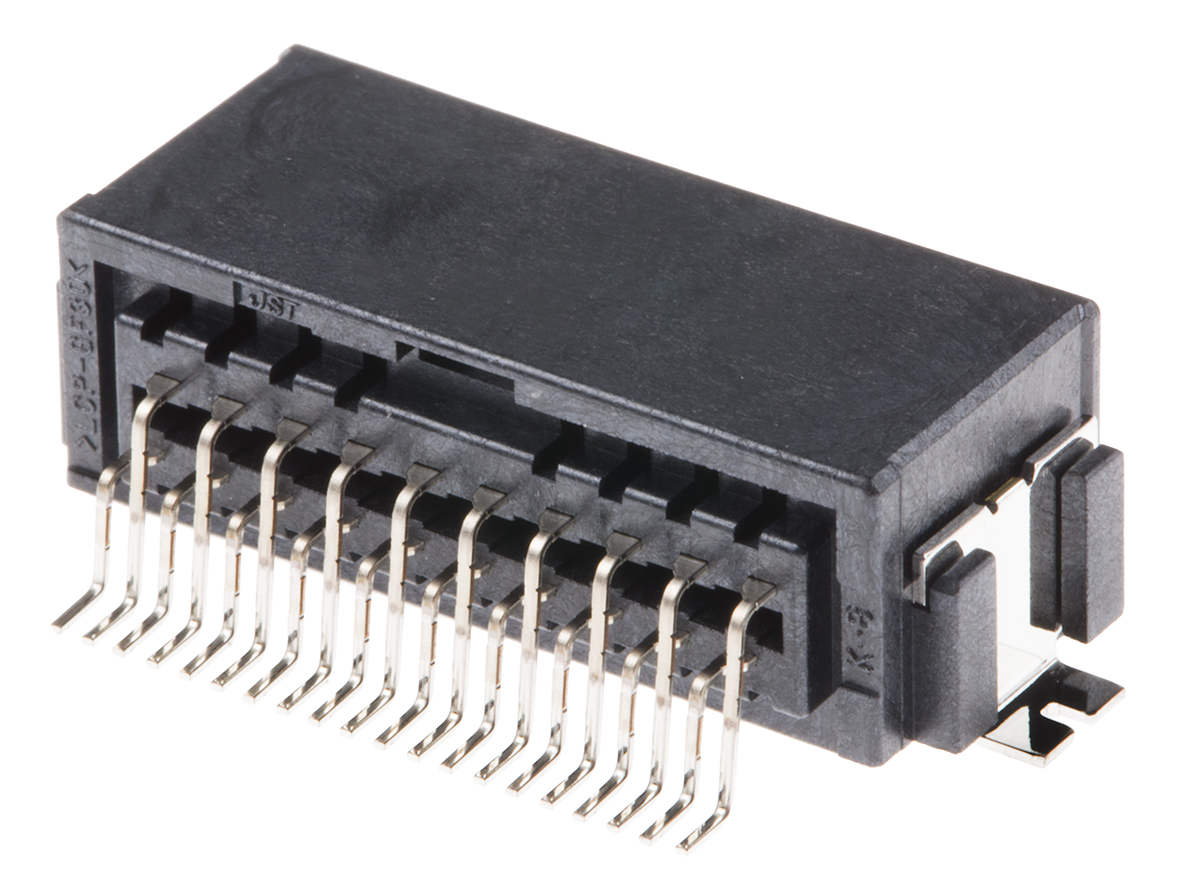 This is CPT Series 1 Row 20 Way Surface Mount Plug CPT Connector with Solder Termination Method manufactured by JST. The manufacturer part number is SM20B-CPTK-1A-TB. The product has a current rating of 3a. Whereas, the minimum operating temperature of the product is -40°c. The product is available in surface mount configuration. In addition, male is the available "Gender" of the product. It has a decent black colour. It allows solder termination method. In addition, the height is 9.3mm. The product also features robust glass filled lcp housing material. Furthermore, the product is 27.6mm wide. The product comes in 10.6mm depth. It comes in 1 of rows. The high-quality gold over nickel is used as contact plating material. The product cpt, is a highly preferred choice for users. In addition, it is corded yes . The product contains 20 contacts. It comes in cpt connector configuration. It has a maximum operating temperature of +100°c. The product is made from sturdy copper alloy materials.