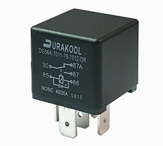 This is SPDT Plug In Non-Latching Relay 120 A 12V dc For Use In Automotive Applications manufactured by Durakool. The manufacturer part number is DG56A-7011-96-1012-M1. It is capable of doing 107cycles in a lifetime . While it carries 30v dc of maximum DC switching voltage. It has a maximum operating temperature of +125°c. The product complies with all safety standards, such as rohs compliant. The product is available in plug in configuration. Robust coil power of 1.8w. The product dg56, is a highly preferred choice for users. It is integrated with 40a switching current. The coil voltage of the product is 12v dc. The product comes in 26.2mm depth. In addition, the height is 41mm. It has a minimum 40 a DC switching current . Its accurate length is 26.2mm. Whereas, the minimum operating temperature of the product is -40°c. The contact is equipped with spdt configuration. The product has 500v rms isolation coil to contact. The product is made from sturdy agsnoino materials. It has equipped with 1 poles. The terminal is a quick connect type. It holds up to 85ω coil resistance.