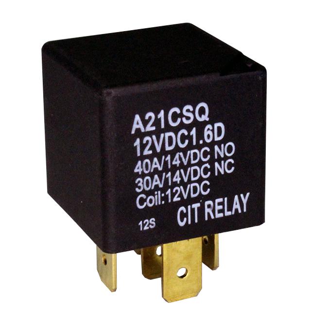 This is manufactured by CIT Relay and Switch. The manufacturer part number is A21CSQ12VDC1.6D. It is assigned with possible HTSUS value of 8536.41.0050. The product is rohs compliant. The coil voltage of the product is 12vdc. Moreover, it has plug in, quick connect - 0.250" (6.3mm) terminal style. The product has -40°c ~ 125°c operating temperature range. It holds up to 90 ohms coil resistance. It has a coil current of 133.3 ma. The coil is a non latching type. Robust coil power of 1.6w. In addition, it is reach unaffected. On the other hand, 8.4 vdc is the given crucial/must operating voltage. The cit relay and switch's product offers user-desired applications. It also has a spdt (1 form c) contact form. Its typical moisture sensitivity level is 1 (unlimited). The operating time of the product is 7 ms. While the must release voltage is a 1.2 vdc. It has a long 13 weeks standard lead time. It has a contact current rating of 40 a. The splendid features of the product include diode, sealed - fully. The product is available in socketable configuration. The product a2, is a highly preferred choice for users. The product's switching voltage is 75vdc - max. While 5 ms is its release time. In addition, tray is the available packaging type of the product. The product is designated with the ear99 code number. Moreover, it corresponds to a21csq, a base product number of the product. The product is made from sturdy silver tin oxide (agsno) materials.