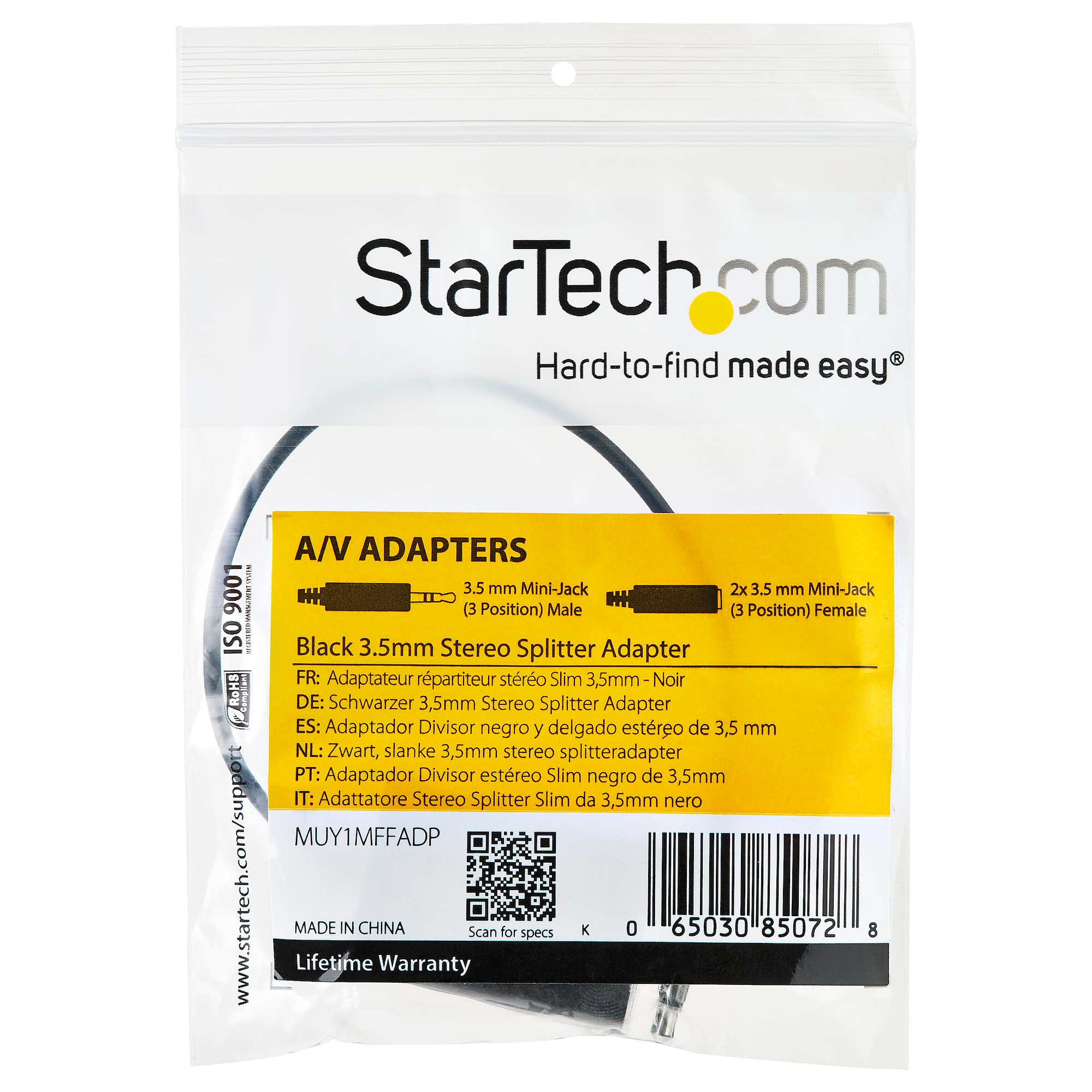 This is 152.4mm 3 Pin Male 3.5 mm Mini-Jack to 3 Pin Female 3.5 mm Mini-Jack Audio Cable Assembly manufactured by StarTech.com. The manufacturer part number is MUY1MFFADP. Connector 2 is a female connector. The product complies with all safety standards, such as ce, reach. This connector 1 is a male. The sheath has an adorable black colour. Its accurate length is 152.4mm. Whereas the outer sheath is manufactured from pvc material. While the Connector 2 is 3.5mm stereo jack x 2. Connector 1 is 3.5mm stereo jack.