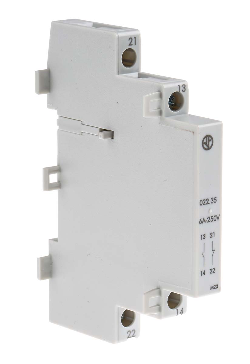 This is DIN Rail Mount Auxiliary Contact with Screw Terminal NO/NC 6 A 230 V manufactured by Finder. The manufacturer part number is 022.35. The integrated contact has 230 v ac of voltage rating. The rated contact current is 6 a. The product 22, is a highly preferred choice for users. It has dpst pole and throw configuration. The product is available in din rail mount style. The normal state configuration includes 1nc + 1no. The product contains 1 contacts. The terminal is a screw type.