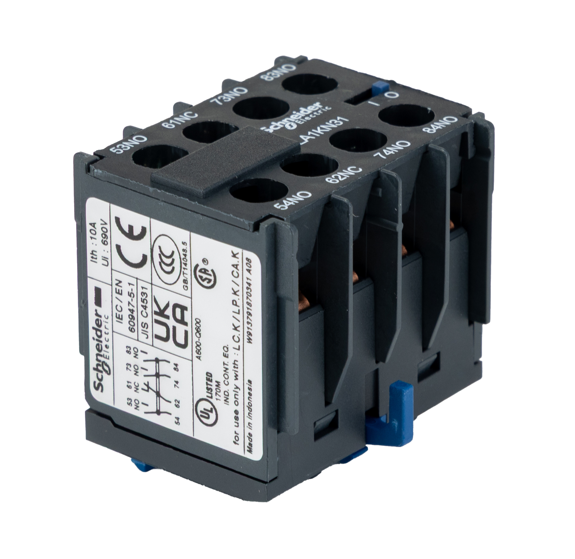 This is Clip On Auxiliary Contact with Screw Terminal 3NO/NC 10 A 600 V ac manufactured by Schneider Electric. The manufacturer part number is LA1KN31. Better World Verification Options - green premium. Is it a better world product? yes. The integrated contact has 600 v ac of voltage rating. The product has -25 → +50 °c of operating temperature range. The rated contact current is 10 a. The product la1k, is a highly preferred choice for users. Whereas, the minimum operating temperature of the product is -25°c. It has 4p pole and throw configuration. The product is available in front mount style. It features tesys k range. The normal state configuration includes 1nc + 3no. The product contains 4 contacts. It has a maximum operating temperature of +50°c. The terminal is a screw type. The product tesys, is a highly preferred choice for users. It is a type of auxiliary contact block accessory. In addition, box is the available packaging type of the product. The product is suitable for use with multiple series. It has a long 5 weeks standard lead time. The schneider electric's product offers user-desired applications.