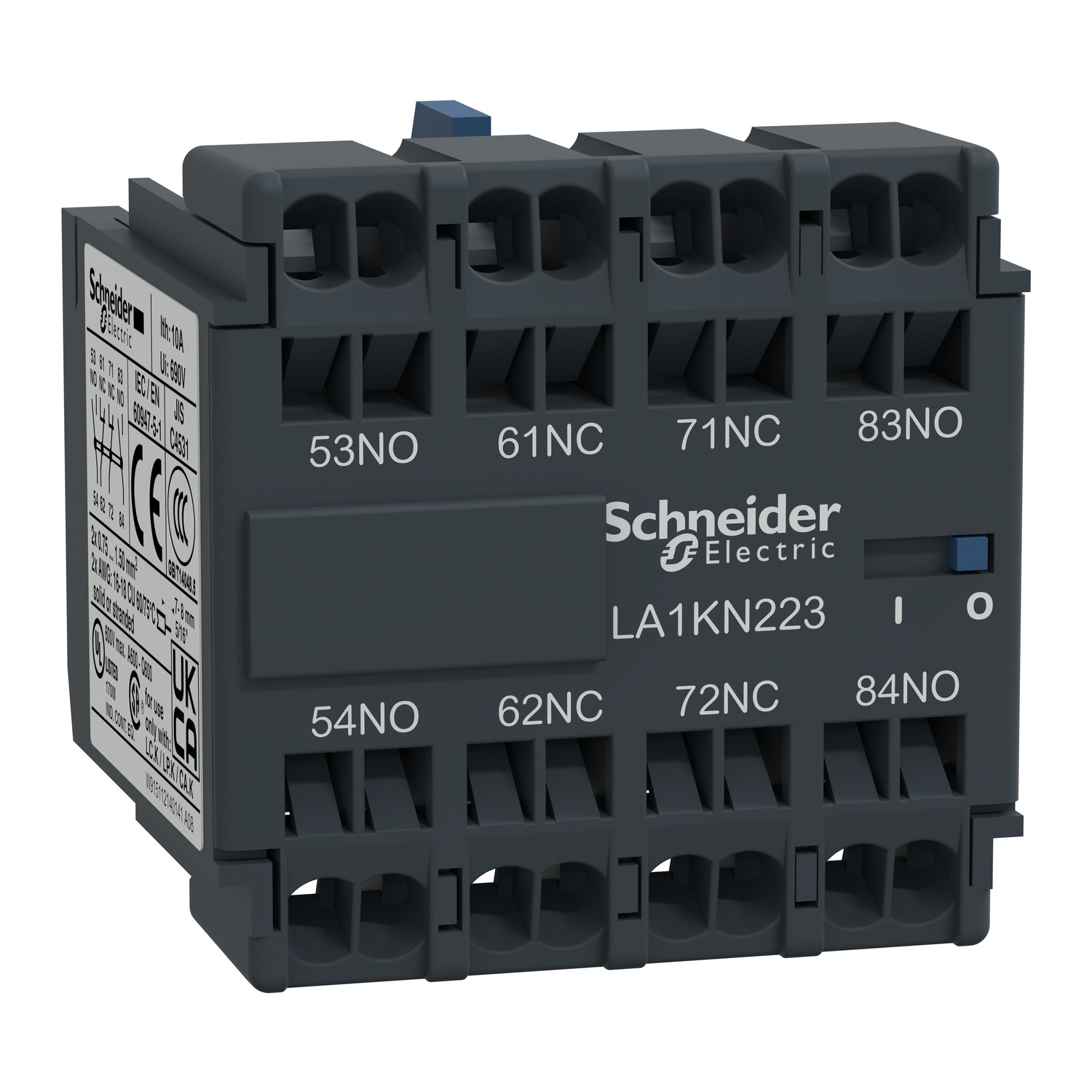 This is Clip On Auxiliary Contact with Cage Clamp Terminal 4NO 10 A 600 V ac manufactured by Schneider Electric. The manufacturer part number is LA1KN403. Better World Verification Options - green premium. Is it a better world product? yes. The integrated contact has 600 v ac of voltage rating. The rated contact current is 10 a. The product la1k, is a highly preferred choice for users. It has 4p pole and throw configuration. The product is available in front mount style. The normal state configuration includes 4no. The product contains 4 contacts. The terminal is a cage clamp type. The product is rohs3 compliant. The product tesys, is a highly preferred choice for users. It is a type of auxiliary contact block accessory. In addition, it is reach unaffected. Its typical moisture sensitivity level is not applicable. In addition, box is the available packaging type of the product. It has a long 5 weeks standard lead time. The schneider electric's product offers user-desired applications.