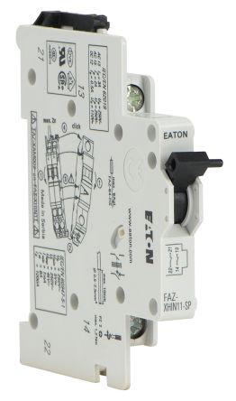 This is DIN Rail Mount Auxiliary Contact with Screw Terminal NO/NC 3 A ac 500 mA dc 120 V dc 240 V ac manufactured by Eaton. The manufacturer part number is FAZ-XHIN11. The integrated contact has 120 v dc, 240 v ac of voltage rating. The rated contact current is 3 a ac, 500 ma dc. The product faz, is a highly preferred choice for users. It has spdt pole and throw configuration. The product is available in din rail mount style. The normal state configuration includes no/nc. The product contains 2 contacts. The terminal is a screw type.