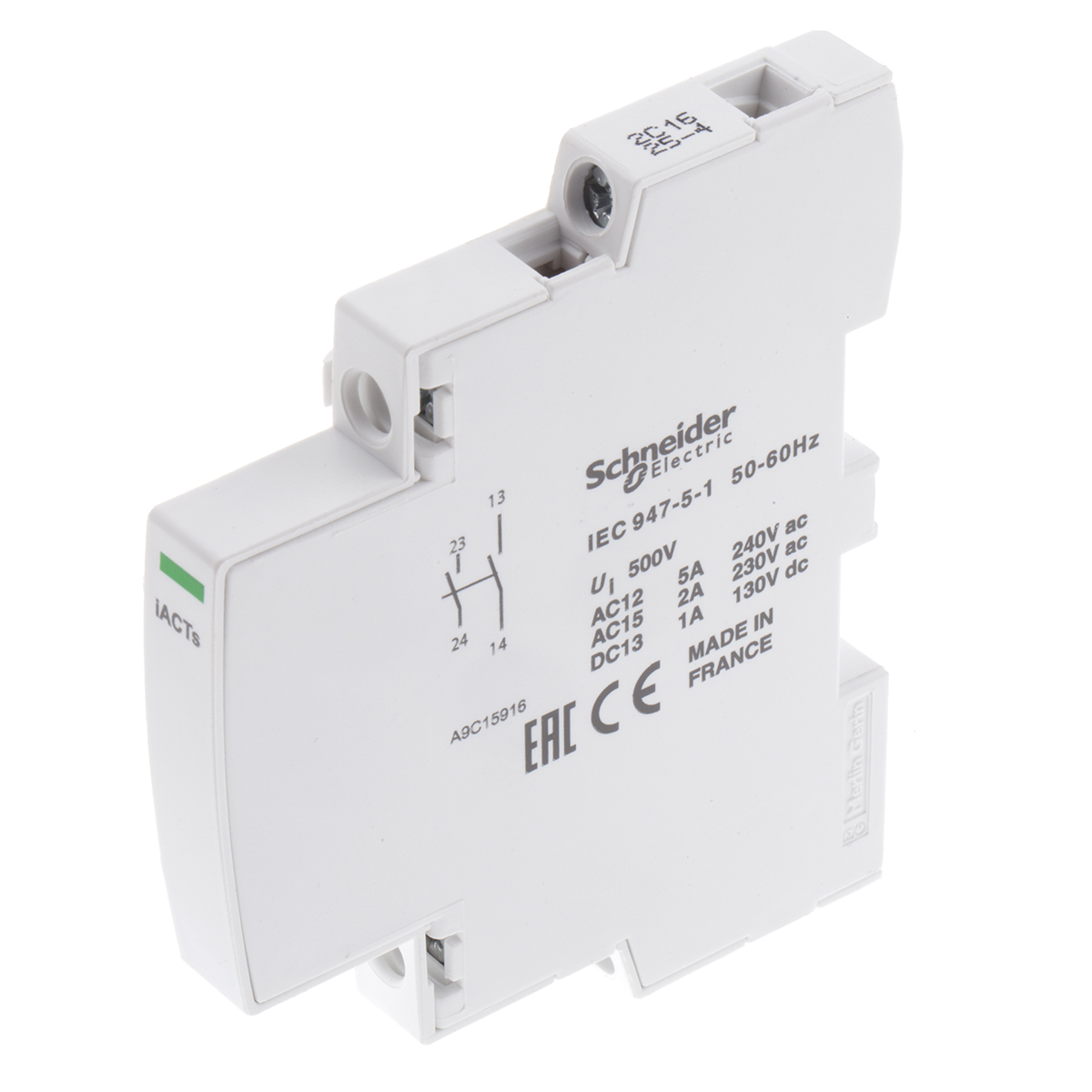 This is Acti 9 iACT Contactor 2NO 2 A 24 V dc Coil manufactured by Schneider Electric. The manufacturer part number is A9C15916. The integrated contact has 24 → 130 v dc, 24 → 240 v ac of voltage rating. The normal state configuration includes 2no. The rated contact current is 2 a. The product iact, is a highly preferred choice for users. Whereas, the minimum operating temperature of the product is -5°c. It has dp pole and throw configuration. The product is available in din rail mount style. It features acti 9 range. The product contains 2 contacts. It has a maximum operating temperature of +50°c. The terminal is a screw type.