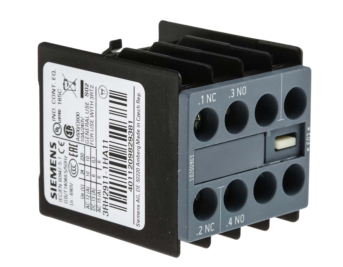 This is Snap-On Auxiliary Contact with Screw Terminal NO/NC 6 A dc 10 A ac 250 V dc 690 V ac manufactured by Siemens. The manufacturer part number is 3RH2911-1HA11. The integrated contact has 250 v dc, 690 v ac of voltage rating. The normal state configuration includes 1nc + 1no. The product has -25 → +60 °c of operating temperature range. The rated contact current is 6 a dc, 10 a ac. The product 3rh2, is a highly preferred choice for users. Whereas, the minimum operating temperature of the product is -25°c. It has dpst pole and throw configuration. The product is available in snap-on style. It features sirius innovation range. The product contains 2 contacts. It has a maximum operating temperature of +60°c. The terminal is a screw type.