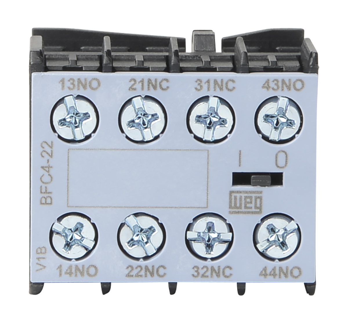 This is Front Mount Auxiliary Contact Block with Screw Terminal 2NO/2NC 10 A 690 V ac manufactured by WEG. The manufacturer part number is BFC4-22. The integrated contact has 690 v ac of voltage rating. The product has -25 → +55 °c of operating temperature range. The rated contact current is 10 a. The product bfc4, is a highly preferred choice for users. It has 4pst pole and throw configuration. The product is available in front mount style. The normal state configuration includes 2nc + 2no. The product contains 4 contacts. The terminal is a screw type.
