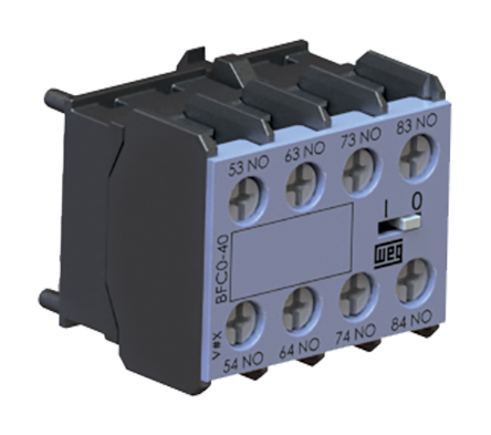 This is Front Mount Auxiliary Contact Block with Screw Terminal 3NO/NC 10 A 690 V ac manufactured by WEG. The manufacturer part number is BFB-31 EN. The integrated contact has 690 v ac of voltage rating. The product has -25 → +55 °c of operating temperature range. The rated contact current is 10 a. The product bfb, is a highly preferred choice for users. It has 4pst pole and throw configuration. The product is available in front mount style. The normal state configuration includes 1nc + 3no. The product contains 4 contacts. The terminal is a screw type.