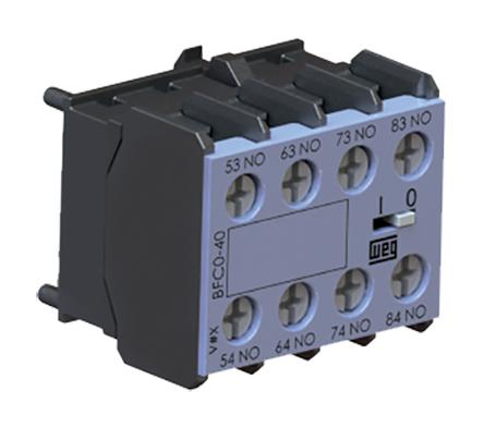 This is Front Mount Auxiliary Contact Block with Screw Terminal 4NO 10 A 690 V ac manufactured by WEG. The manufacturer part number is BFC0-40. The integrated contact has 690 v ac of voltage rating. The product has -25 → +55 °c of operating temperature range. The rated contact current is 10 a. The product bfc0, is a highly preferred choice for users. It has 4pst pole and throw configuration. The product is available in front mount style. The normal state configuration includes 4no. The product contains 4 contacts. The terminal is a screw type.
