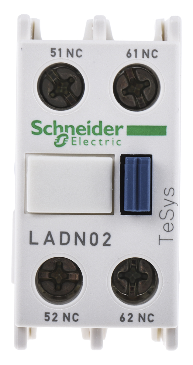 This is Front Mount Auxiliary Contact Block with Screw Terminal 2NC manufactured by Schneider Electric. The manufacturer part number is LADN02. Better World Verification Options - green premium. Is it a better world product? yes. The product ladn, is a highly preferred choice for users. It has dp pole and throw configuration. The product is available in front mount style. The normal state configuration includes 2nc. The product contains 2 contacts. The terminal is a screw type.