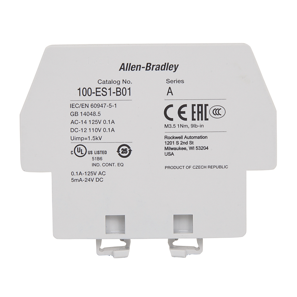 This is Auxiliary Contact 1 NO 1 NC manufactured by Allen Bradley. The manufacturer part number is 100-ES3-11.