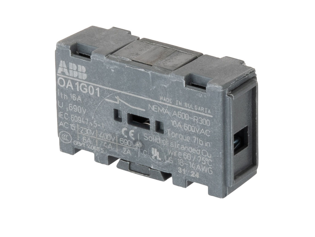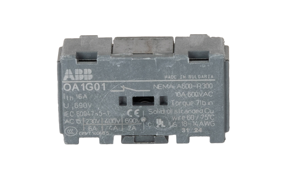 This is Auxiliary Contact - 1NC 1 Contact Snap-On 6 A ac 10 A dc manufactured by ABB. The manufacturer part number is OA1G01 1SCA022353R4890. The integrated contact has 400 v dc, 690 v ac of voltage rating. The rated contact current is 6 a ac, 10 a dc. The product oa1g, is a highly preferred choice for users. It has sp pole and throw configuration. The product is available in snap-on style. The normal state configuration includes 1nc. The product contains 1 contacts. The terminal is a screw type.