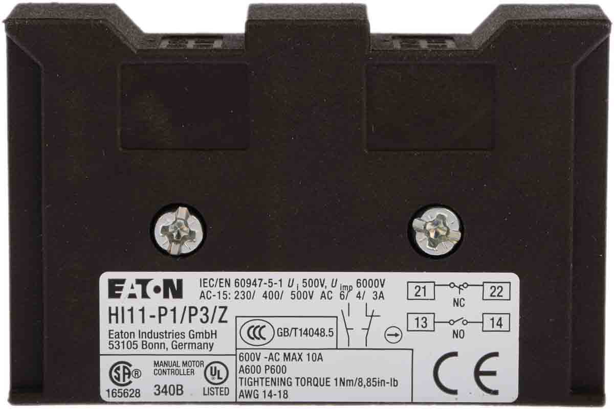 This is Auxiliary Contact - 1NC + 1NO 2 Contact Side Mount 10 A manufactured by Eaton. The manufacturer part number is 78819020 HI11-P1/P3Z. The rated contact current is 10 a. The product is available in side mount style. The normal state configuration includes 1nc + 1no. The product contains 2 contacts. It has a maximum operating temperature of +50°c. The terminal is a screw type.