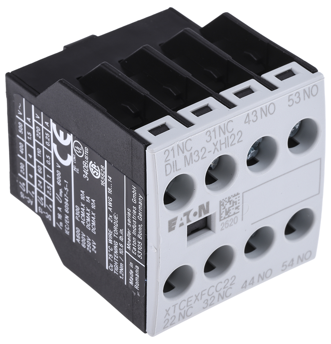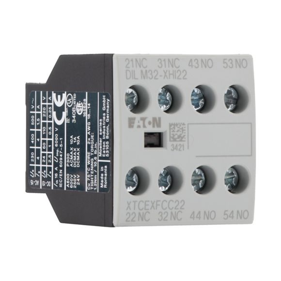 The Eaton 277377 DILM32-XHI22 is a 4-pole auxiliary contact module designed for integration with Eaton's DILM series contactors. It features a configuration of 2 normally open (NO) and 2 normally closed (NC) contacts, providing versatile switching options for control circuits. The module is front-mountable with screw terminals, ensuring secure and reliable connections. It supports a contact current rating of 4A AC and 10A DC. With voltage ratings of 220V DC and 500V AC, it is suitable for various industrial automation applications.