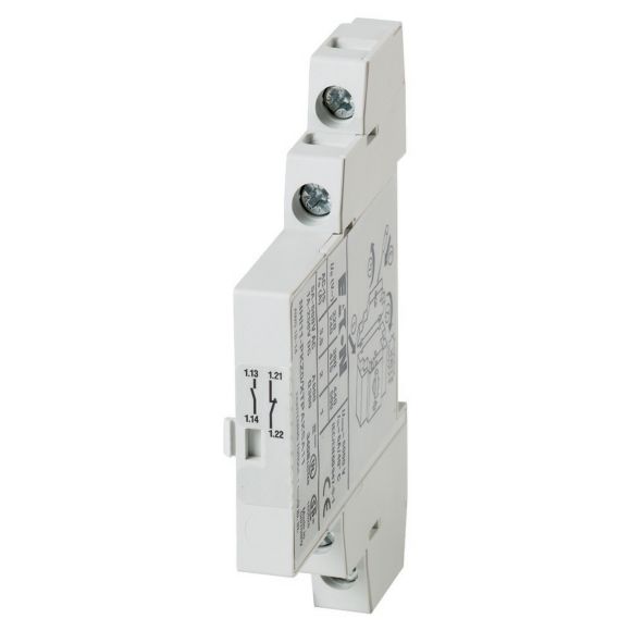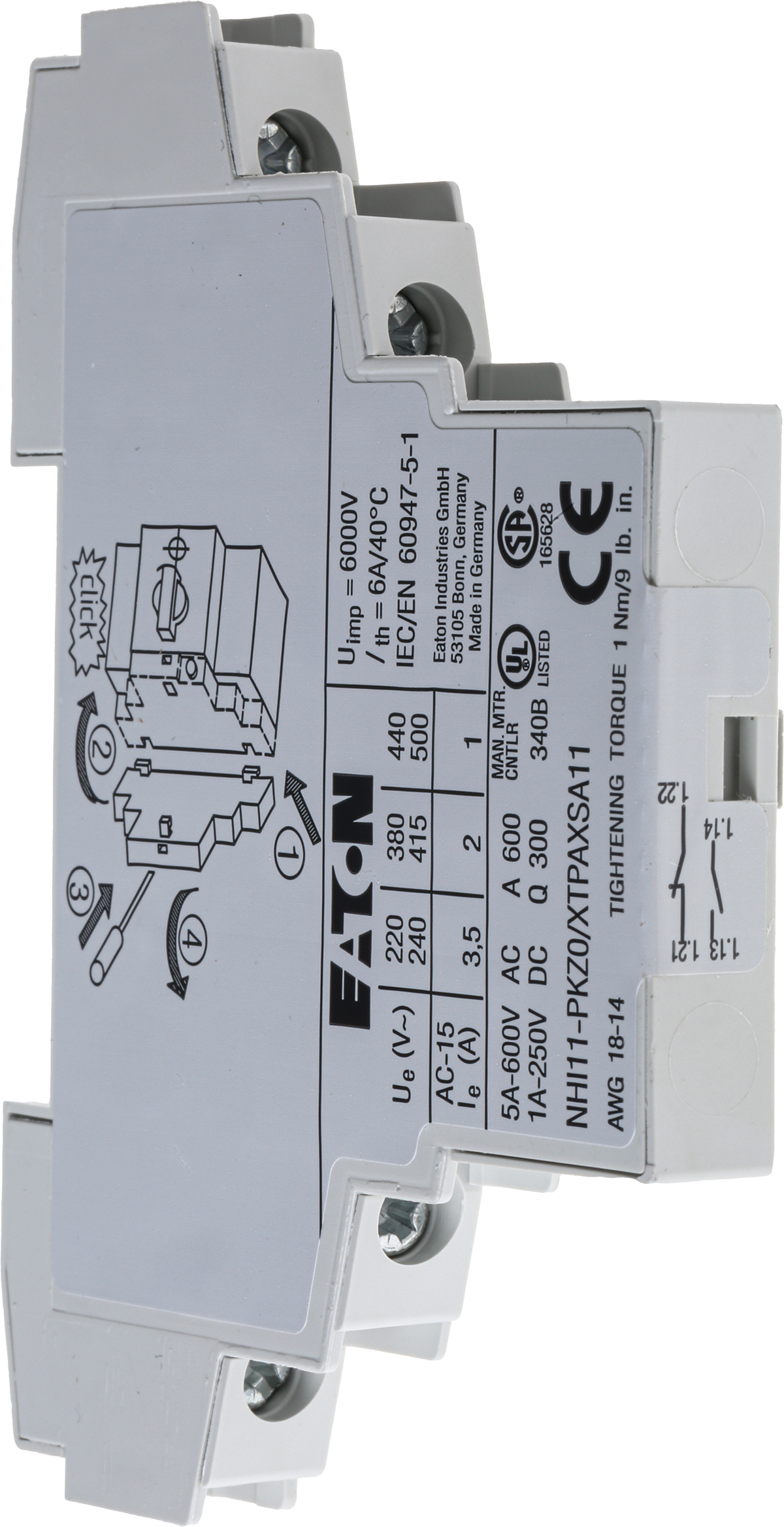 This is Auxiliary Contact - 1NC + 1NO 2 Contact Side Mount 2 A dc 3.5 A ac manufactured by Eaton. The manufacturer part number is 072896 NHI11-PKZ0. The integrated contact has 220 v dc, 500 v ac of voltage rating. The normal state configuration includes 1nc + 1no. The product has -25 → +55 °c of operating temperature range. The rated contact current is 2 a dc, 3.5 a ac. The product nhi11, is a highly preferred choice for users. Whereas, the minimum operating temperature of the product is -25°c. It has dpst pole and throw configuration. The product is available in side mount style. The product contains 2 contacts. It has a maximum operating temperature of +55°c. The terminal is a screw type.