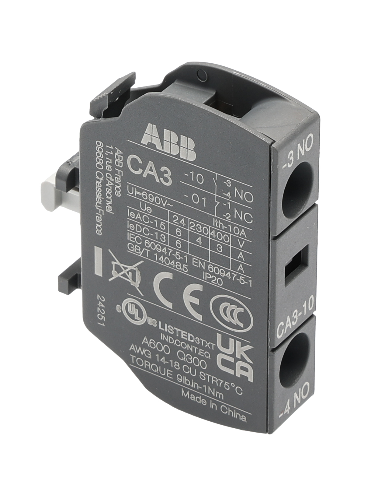 This is AS Auxiliary Contact - 1NO 1 Contact Front Mounting 6 A manufactured by ABB. The manufacturer part number is 1SBN011010T1010 CA3-10. The integrated contact has 690 v of voltage rating. The rated contact current is 6 a. The product ca3, is a highly preferred choice for users. It has 1p pole and throw configuration. The product is available in front mount style. It features as range. The normal state configuration includes 1no. The product contains 1 contacts. The terminal is a screw type.