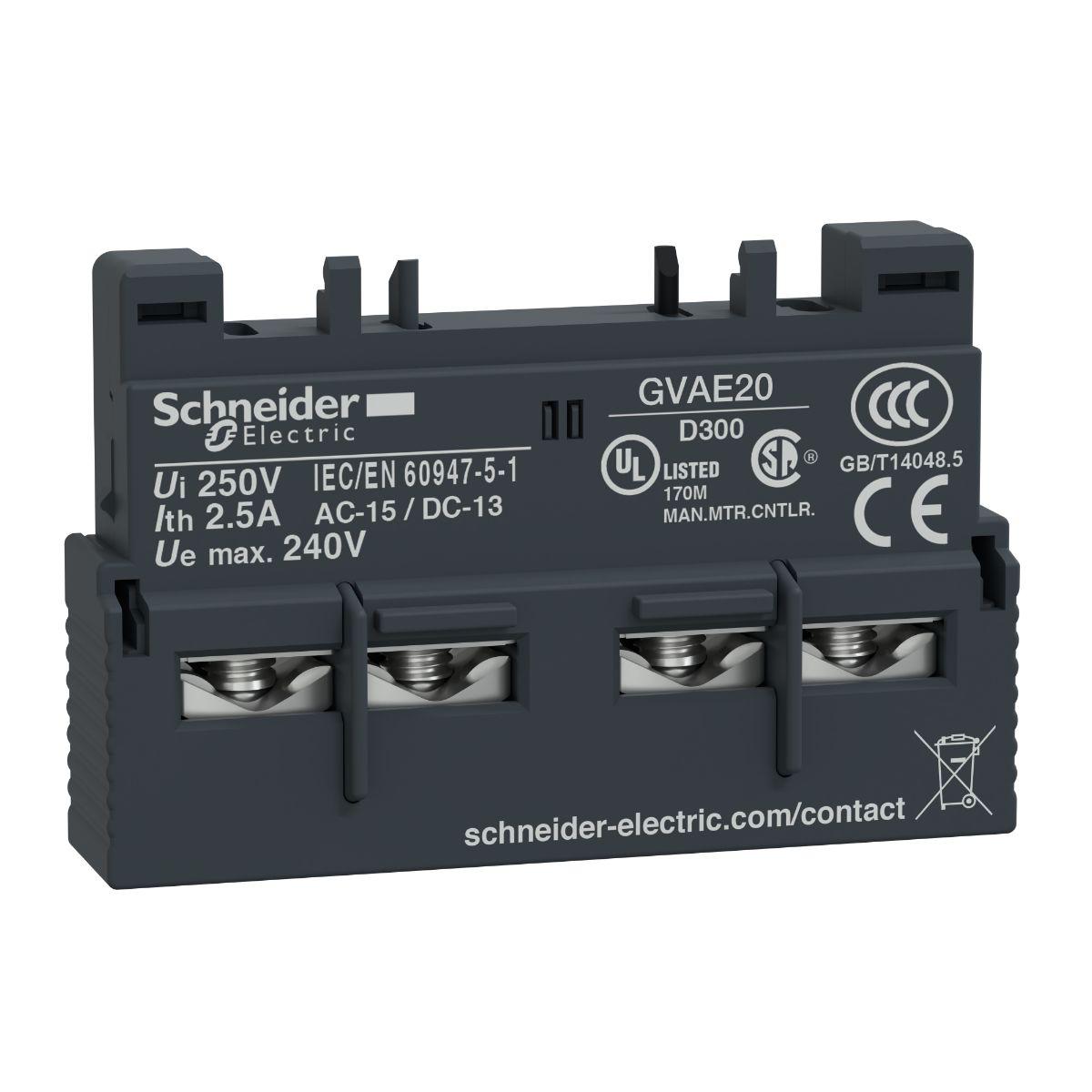 This is TeSys Auxiliary Contact Block - 2NO 2 Contact Side Mount 2.5 A manufactured by Schneider Electric. The manufacturer part number is GVAE20TQ. Better World Verification Options - green premium. Is it a better world product? yes. The rated contact current is 2.5 a. The product gvae, is a highly preferred choice for users. The product is available in side mount style. It features tesys range. The normal state configuration includes 2no. The product contains 2 contacts.